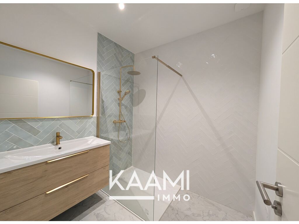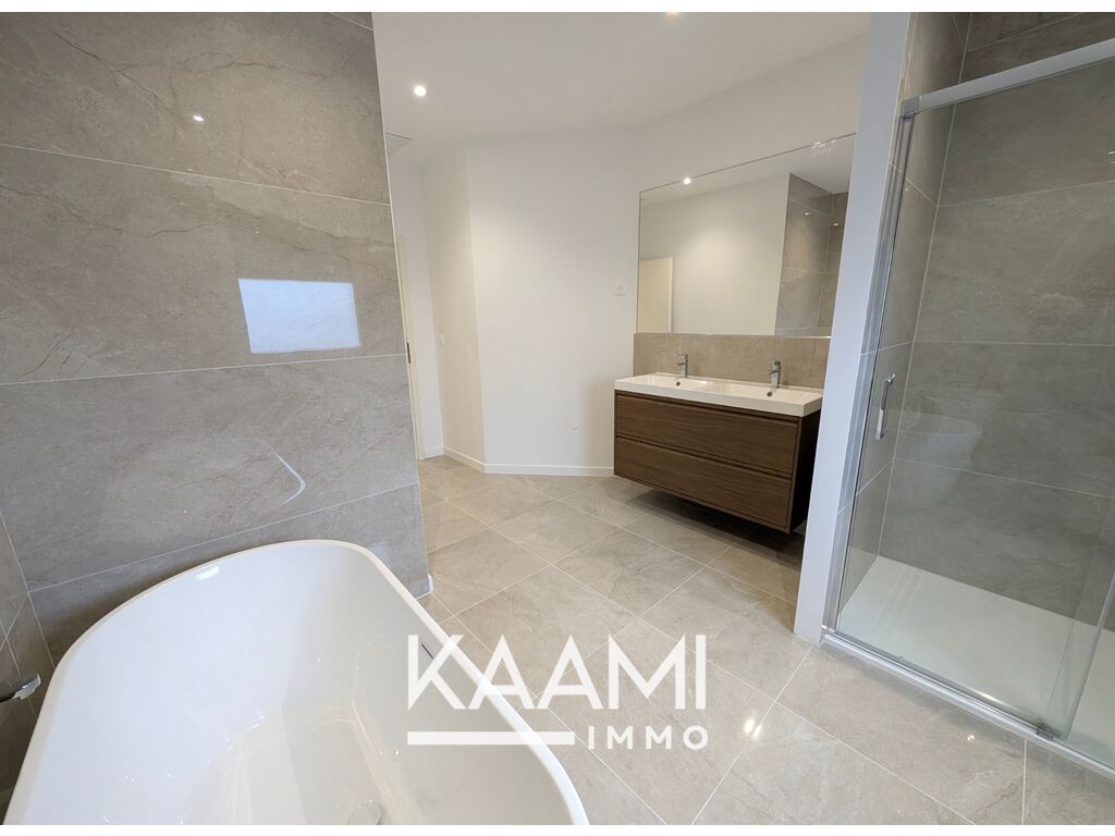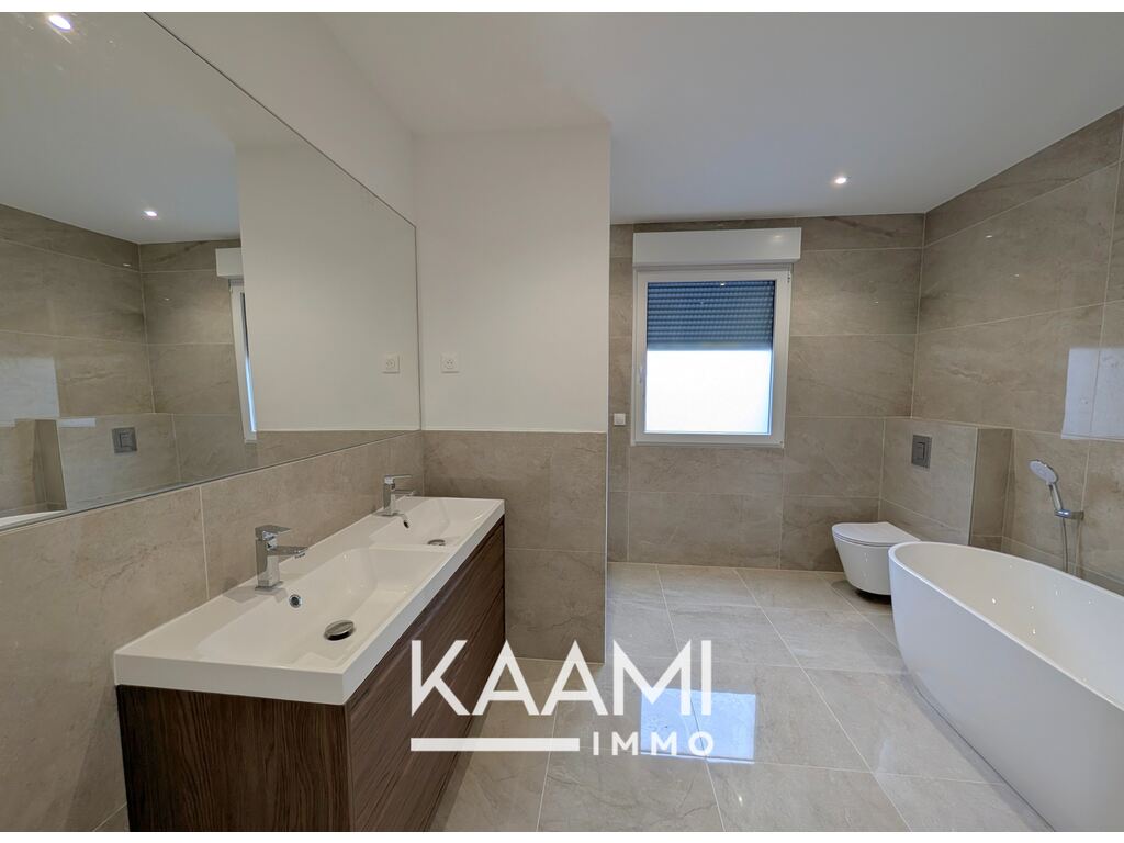 - Salle de bain principale de 11 m² avec baignoire, douche italienne, meuble double vasques et WC.